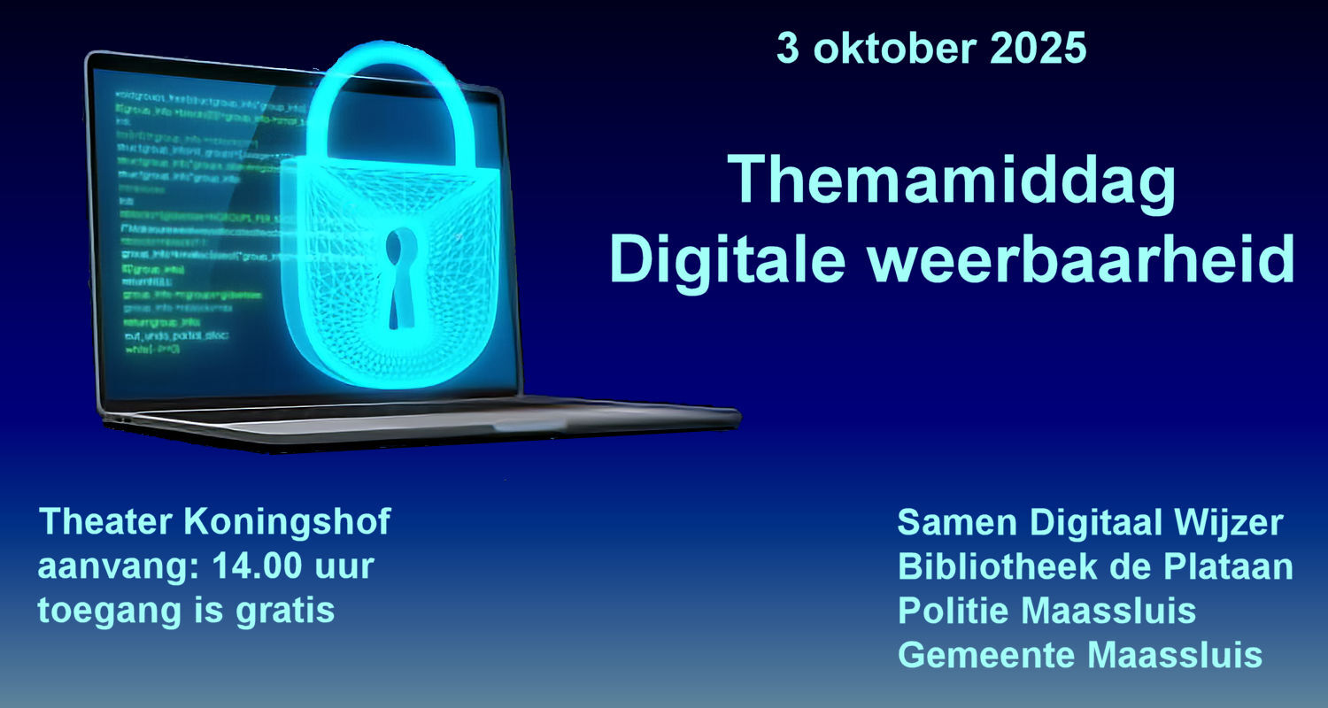 Op vrijdag 3 oktober organiseren Samen Digitaal Wijzer, Bibliotheek de Plataan, politie en de gemeente Maassluis een gratis themamiddag over Digitale weerbaarheid in Theater Koningshof te Maassluis.